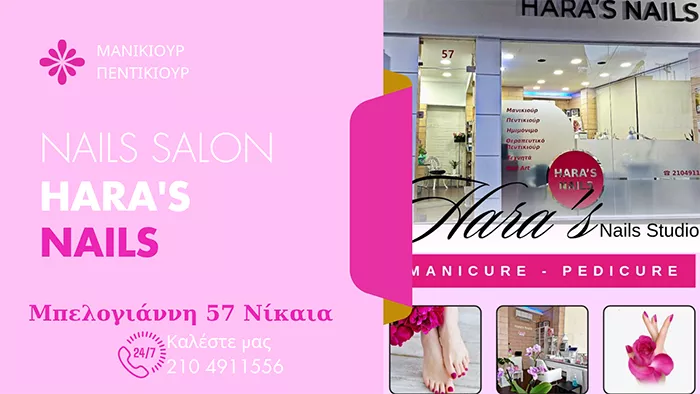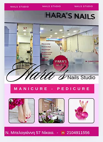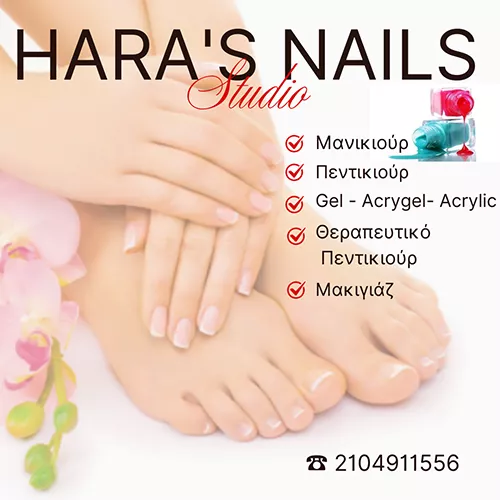 Στο Hara's Nails, η δημιουργικότητα έγινε τέχνη! Μια καλλιτεχνική εργασία η οποία απαιτεί άριστες γνώσεις τεχνικής και υγιεινής, πνευματική αντίληψη και ΠΆΘΟΣ!!! Με μεγάλη χαρά σας καλωσορίζω σε ένα ζεστό και φιλόξενο χώρο, γεμάτο δημιουργία, προσφέροντας στα άκρα σας την περιποίηση και φροντίδα που τους αξίζει. Οι άριστες παροχές του Hara's Nails, πάντα με γνώμονα την ποιότητα και την αγάπη για επαγγελματισμό, εγγυώνται για το καλύτερο δυνατό αποτέλεσμα σε προσιτές τιμές. Με τη χρήση κορυφαίων επαγγελματικών προϊόντων, τη σχολαστική τήρηση όλων των κανόνων υγιεινής και τη χρόνια εξειδίκευσή μας στο Μανικιούρ, Πεντικιούρ, Θεραπευτικό πεντικιούρ, Ονυχοπλαστική- Τεχνητά Νύχια, Spa- Θεραπείες άκρων, Μακιγιάζ, σας περιμένουμε να απολαύσετε τις υπηρεσίες του Hara's Nails και να ενισχύσουμε παρέα τη φυσική ομορφιά σας!
