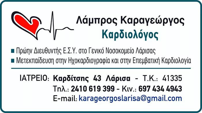 Ο ΛΑΜΠΡΟΣ ΚΑΡΑΓΕΩΡΓΟΣ, πρώην Διευθυντής ΕΣΥ στην Καρδιολογική Κλινική του Γ.Ν.Λάρισας, είναι απόφοιτος της Ιατρικής Σχολής του Αριστοτέλειου Πανεπιστημίου Θεσσαλονίκης. Ειδικεύτηκε στην ΚΑΡΔΙΟΛΟΓΙΑ στο Νοσοκομείο “ΕΥΑΓΓΕΛΙΣΜΟΣ” και μετεκπαιδεύτηκε στα αντικείμενα της ΥΠΕΡΗΧΟΓΡΑΦΙΑΣ και της ΕΠΕΜΒΑΤΙΚΗΣ ΚΑΡΔΙΟΛΟΓΙΑΣ, στο ίδιο Νοσοκομείο. Ασκεί την ΚΑΡΔΙΟΛΟΓΙΑ από το 1997 και εργάσθηκε τόσο ως ιδιώτης, όσο και κυρίως ως ιατρός ΕΣΥ. Τα τελευταία 21 έτη υπηρέτησε ως Επιμελητής και αργότερα ως Διευθυντής ΕΣΥ στο Γ.Ν.Λάρισας. Μετά την αποχώρηση του από το Νοσοκομείο, οργάνωσε το επόμενο εργασιακό βήμα του και από το Μάρτιο του 2023 λειτουργεί το ιδιωτικό ιατρείο του στη Λάρισα. Το ιατρείο είναι προσβάσιμο από οποιοδήποτε σημείο της πόλης και της περιφέρειας. Είναι ισόγειο, με μεγάλους, λειτουργικούς, καλαίσθητους και εργονομικά σχεδιασμένους χώρους και εξοπλισμένο πλήρως με τελευταίας τεχνολογίας και κορυφαίας ποιότητας ιατρικά μηχανήματα. Διαθέτει ράμπα για ΑΜΕΑ και τρεις θέσεις στάθμευσης. Το υψηλό αίσθημα ευθύνης που τον διακρίνει, η εμπειρία και η υψηλή επιστημονική κατάρτισή του, σε συνδυασμό με τις δυνατότητες που προσφέρει ο σύγχρονος ιατροτεχνολογικός εξοπλισμός, διαμορφώνουν τους όρους και εγγυώνται τους στόχους του εγχειρήματός του, που δεν είναι άλλοι από την πρώιμη και ασφαλή διάγνωση, αντιμετώπιση και διαχείριση των καρδιαγγειακών νοσημάτων και την πρόληψη και προαγωγή της ψυχοσωματικής υγείας των ασθενών του, με όρους ενεργητικής συμμετοχής και αποδοτικής συνεργασίας.