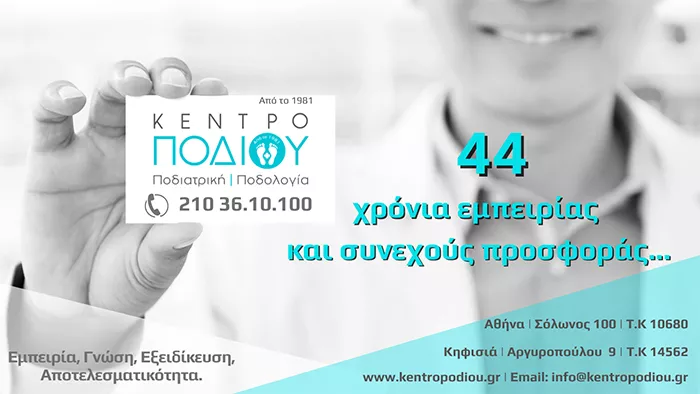 Το "ΚΕΝΤΡΟ ΠΟΔΙΟΥ" ξεκίνησε την πορεία του το 1981. Έκτοτε και μέχρι σήμερα συνεχίζει την προσφορά υπηρεσιών σε ανθρώπους που αντιμετωπίζουν προβλήματα στα κάτω άκρα. Με τη γνώση και τη συνεχή δραστηριοποίηση στον χώρο της Ποδιατρικής-Ποδολογίας, είμαστε σε θέση να παρέχουμε υπηρεσίες υψηλού επιπέδου, σε όσους επιθυμούν επαγγελματισμό και αποτελεσματικότητα. Το έμπειρο προσωπικό μας, Ποδίατρος - Ποδολόγοι, εξειδικεύεται στην αντιμετώπιση ακόμη και των πιο δύσκολων παθήσεων των άκρων.