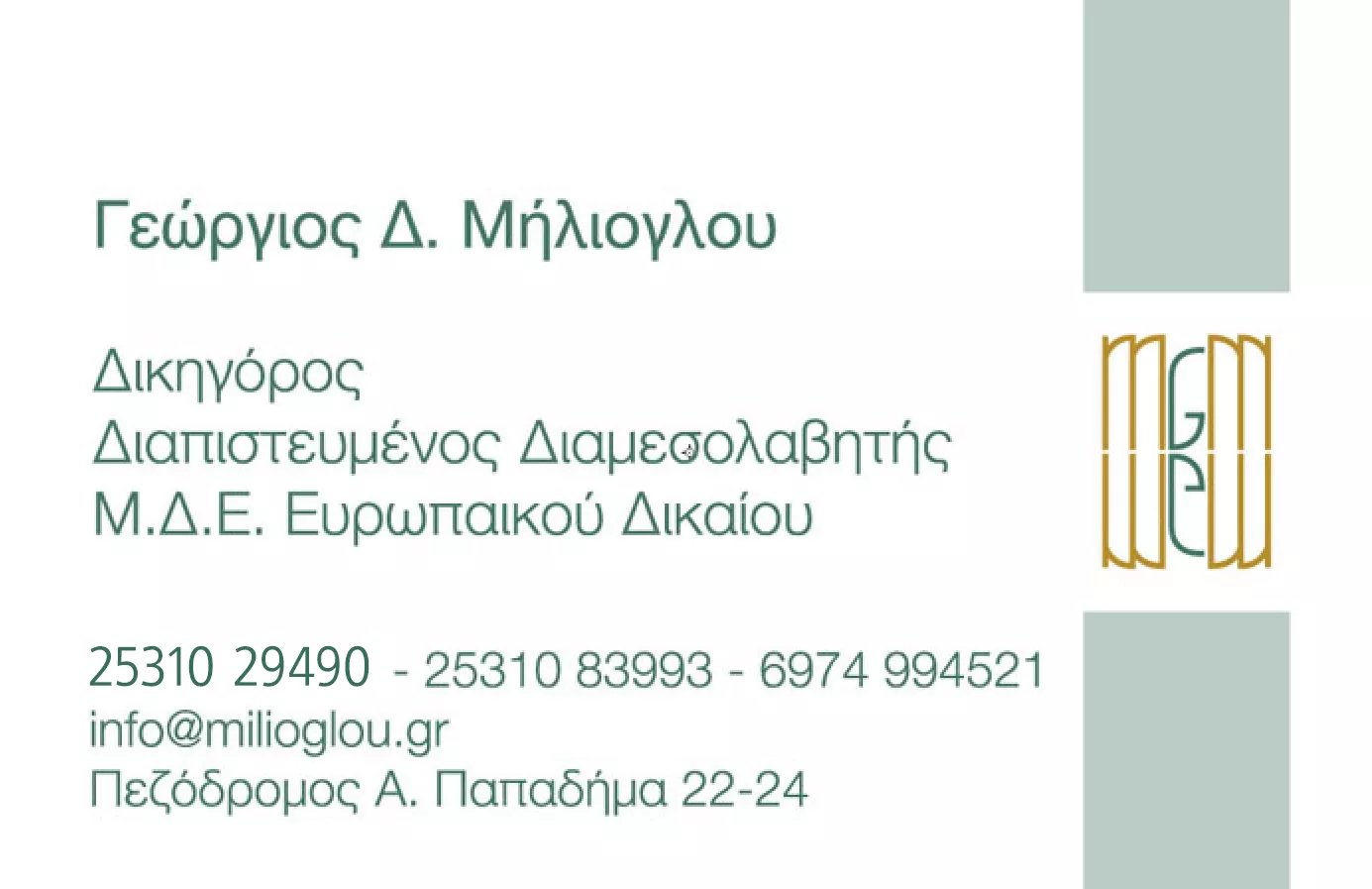 Το δικηγορικό γραφείο λειτουργεί στην Κομοτηνή από το έτος 1986, απασχολούμενο με υποθέσεις αστικού και ποινικού δικαίου, και σε θέματα εμπορικού, τραπεζικού, εταιρικού και δικαίου επιχειρήσεων. Νομικοί Σύμβουλοι στην Τράπεζα Πειραιως Α.Ε. και στην ασφαλιστική εταιρεία ΙΝΤΕΡΣΑΛΟΝΙΚΑ. Δυνατότητα επίλυσης διαφορών μέσω του θεσμού της διαμεσολάβησης και των διαπραγματεύσεων (πιστοποιημένος διαμεσολαβητής). Άριστη γνώση αγγλικών, γαλλικών.