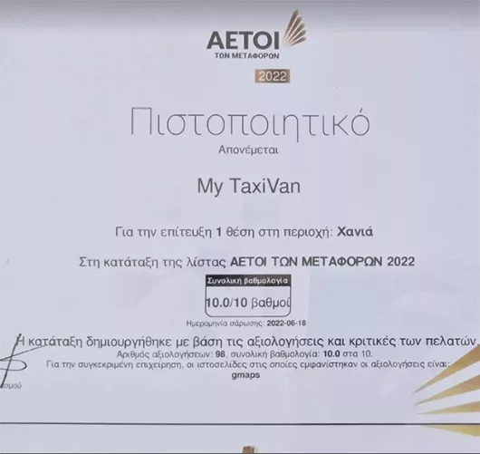 Η εταιρεία μας "My taxi van" ιδρύθηκε το 1997 στα Χανιά Κρήτης. Είναι μια τοπική εταιρεία που προσφέρει σε άτομα και εταιρείες άνετο και ασφαλές ταξίδι με έμπειρους επιχειρηματίες οδηγούς με πολυετή εμπειρία. Η εταιρεία "My taxi van" μετράει πολύ μεγάλο αριθμό πελατών παγκοσμίως και στην Ελλάδα. Ο στόλος "My taxi van" αποτελείται από νέα πολυτελή οχήματα υψηλής τεχνολογίας. Το standard ταξί μπορεί να φιλοξενήσει έως 4 άτομα με τις αποσκευές τους. Το ταξί είναι ένα άνετο, πολυτελές φορτηγό 8 θέσεων που μπορεί να φιλοξενήσει έως 8 επιβάτες με τις αποσκευές τους. Το mini bus είναι επίσης υψηλών προδιαγραφών με χωρητικότητα έως και 11 επιβατών. Τα αυτοκίνητά μας είναι διαθέσιμα 24 ώρες την ημέρα, 365 ημέρες το χρόνο.
