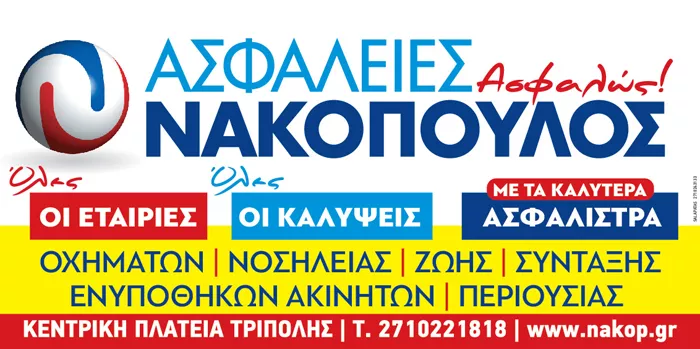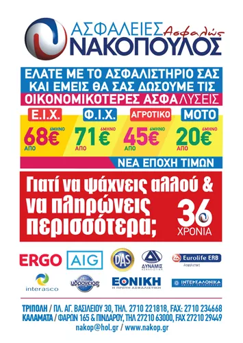 H ασφαλιστική εταιρεία ΝΑΚΟΠΟΥΛΟΣ Ι ΚΩΝ & ΣΙΑ ΕΕ εδρεύει στην Τρίπολη. Με την 30ετή παρουσία της στο χώρο των ασφαλειών και τη μεγάλη εμπειρία της, ειδικεύεται στις ασφάλειες αυτοκινήτων, μοτοσυκλετών και σκαφών, με στόχο την ασφάλεια της καθημερινής σας μετακίνησης, καθώς και στις ασφάλειες φορτηγών και αγροτικών, για την προστασία του επαγγελματία οδηγού, στον καθημερινό του αγώνα για τα προς το ζην. Διατίθενται, επίσης, προγράμματα οδικής βοήθειας. Επιπλέον, η εταιρεία μας προσφέρει ασφάλειες φωτοβολταϊκών (ασφάλιση εργοδοτικής ευθύνης, υλικών, φωτοβολταϊκών πάρκων και φωτοβολταϊκών σε στέγη), ασφάλειες επιχειρήσεων, ασφάλειες αστικής ευθύνης. Τέλος, παρέχει νοσοκομειακή περίθαλψη και συνταξιοδοτικά προγράμματα. Ενημερώσου σωστά και επέλεξε το καλύτερο και οικονομικότερο πρόγραμμα για το όχημα σου, το ενυπόθηκο ακινητό σου, την υγεία και τη σύνταξή σου.