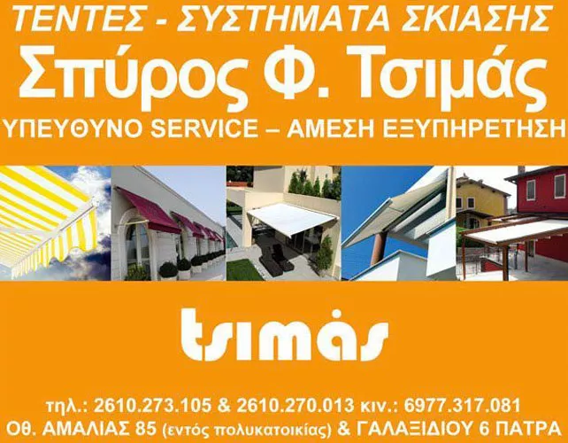 Τέντες και συστήματα σκίασης στην Πάτρα, με την εμπειρία 30 χρόνων, στις καλύτερες τιμές. H εταιρεία ΤΣΙΜΑΣ Φ. ΣΠΥΡΙΔΩΝ δραστηριοποιείται στην Πάτρα και αποτελεί παράδοση στο χώρο της τέντας. Για τριάντα συνεχή έτη, βρίσκεται στο πλευρό του επαγγελματία και ιδιώτη, προσφέροντας τις πιο σύγχρονες, αξιόπιστες και λειτουργικές λύσεις στον τομέα της σκίασης. Οι υπηρεσίες που σας προσφέρουμε περιλαμβάνουν μελέτη, κατασκευή, εγκατάσταση, επισκευή και συντήρηση τεντών κάθε τύπου, εφοδιασμένων κατ' επιλογή με τα πιο σύγχρονα και αξιόπιστα συστήματα αυτοματισμών που διαθέτει η αγορά, αλλά και εξειδικευμένες προτάσεις σκίασης, όπως τεντοπέργκολες, κασετίνες, καποτίνες, roller εσωτερικού χώρου και ποικίλες άλλες ειδικές κατασκευές. Η πολυετής μας πείρα, τα αυστηρά επιλεγμένα υλικά, ο πρωτοποριακός εξοπλισμός, η συνεχής ενημέρωση στο χώρο των σύγχρονων τεχνολογικών εξελίξεων και η συνεργασία μας με τους μεγαλύτερους ευρωπαϊκούς και εγχώριους οίκους αποτελούν εγγύηση για την ικανοποίησή σας.