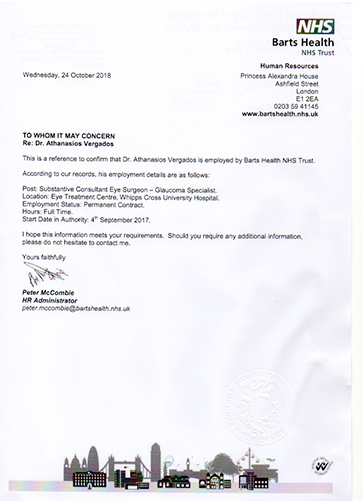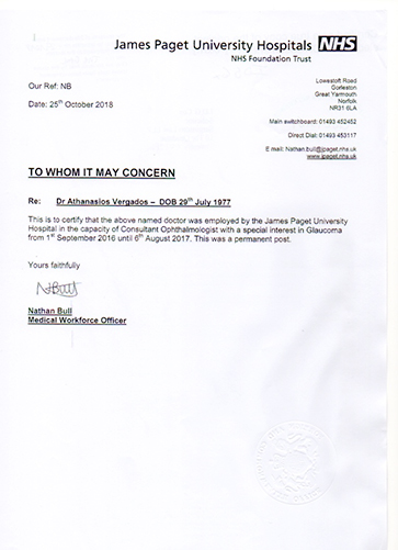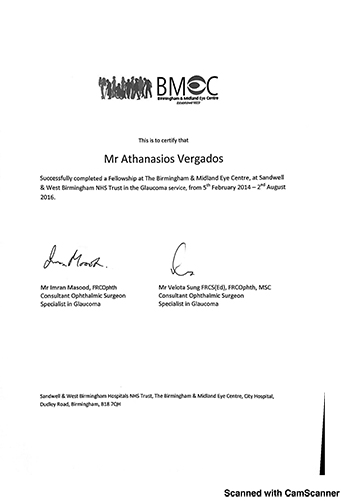 Ο Αθανάσιος Βέργαδος MD, PhD, FEBO, MRCOphth διαθέτει πολυετή εμπειρία στο Ηνωμένο Βασίλειο, όπου εξειδικεύτηκε στο γλαύκωμα και την χειρουργική του καταρράκτη και διετέλεσε Διευθυντής Τμήματος Γλαυκώματος σε πανεπιστημιακά νοσοκομεία του Λονδίνου.