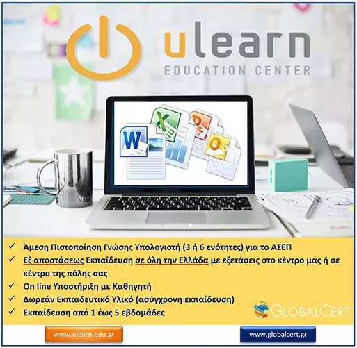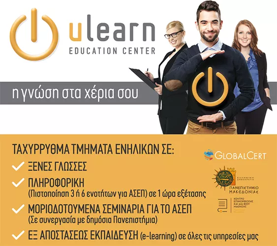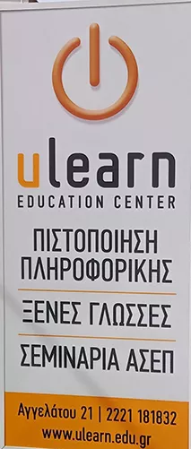 Το Ulearn είναι ένα σύγχρονο εκπαιδευτικό κέντρο ενηλίκων και όχι μόνο. Ένας σύγχρονος και ζεστός χώρος με προηγμένα μέσα εκπαίδευσης και καθοδήγησης, που βοηθάει τους ενήλικες μέσω των ταχύρρυθμων τμημάτων Ξένων Γλωσσών, των Πιστοποιήσεων Πληροφορικής και των Επαγγελματικών Σεμιναρίων, να αποκτήσουν ένα ισχυρό βιογραφικό που είναι απαραίτητο προσόν στη σημερινή αγορά εργασίας. Το κέντρο μας είναι συνεργαζόμενος φορέας των πτυχίων Cambridge-Michigan-TOEIC-IELTS-TIE-LRN-ESB-Nocn κ.α. Επιπλέον παρέχουμε εκπαίδευση των βασικών Ευρωπαϊκών Ξένων Γλωσσών (Αγγλικών-Γαλλικών-Γερμανικών-Ιταλικών-Ισπανικών), των Ιαπωνικών και πιστοποιούμε την γνώση των βασικών δεξιοτήτων στον χειρισμό των Η/Υ για τους διαγωνισμούς του ΑΣΕΠ.