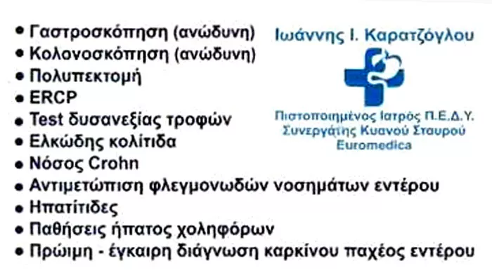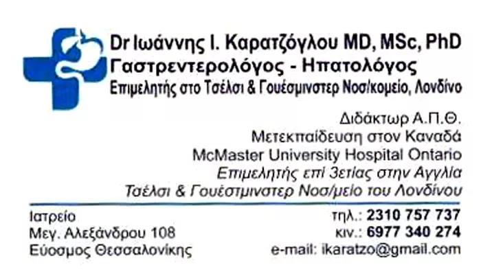 Ο Γαστρεντερολόγος – Ηπατολόγος Ιωάννης Καρατζόγλου διατηρεί ιατρείο στη Θεσσαλονίκη. Φοίτησε στην ιατρική σχολή τουΑριστοτελείου Πανεπιστημίου και μετεκπαιδεύτηκε στον Καναδά, στο University Hospital Ontario. Ο γαστρεντερολόγος παρέχει υπηρεσίες υψηλών προδιαγραφών, σεβόμενος πάντοτε τον ασθενή και τις ανάγκες του. Το ιατρείο του στη Θεσσαλονίκη είναι εξοπλισμένο με σύγχρονες τεχνολογίες, ώστε να ανταποκρίνεται πλήρως στις απαιτήσεις της εποχής. Πραγματοποιούνται γαστροσκοπήσεις, κολονοσκοπήσεις, πολυπεκτομές. Για αντιμετώπιση παθήσεων του ήπατος, των χοληφόρων και του εντέρου, μπορείτε πάντοτε να κλείσετε ένα ραντεβού για κατ’ ιδίαν εξέταση. Ο Γαστρεντερολόγος Ιωάννης Καρατζόγλου διαθέτει ακαδημαϊκή και επαγγελματική εμπειρία ετών και βρίσκεται υπεύθυνα στο πλευρό κάθε ασθενή, προτείνοντας κάθε φορά τη θεραπεία που ενδείκνυται. Ο Γαστρεντερολόγος Ιωάννης Καρατζόγλουέχει σύμβαση με ιδιωτικές ασφαλιστικές εταιρείες είναι είδικός συνεργάτης ενδοσκοπικού Β' ιατρικού Διαβαλκανικού Θεσσαλονίκης και Euromedica Κυανού Σταυρού.