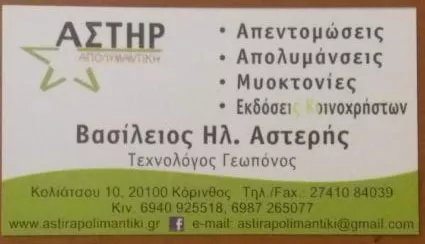 Η Αστήρ απολυμαντική αποτελεί μια εδραιωμένη επιχείρηση στην Κόρινθο με 8 χρόνια παρουσίας στον τομέα ελέγχου παρασίτων. Η εταιρεία μας, παρέχει υψηλού επιπέδου υπηρεσίες τόσο για κατοικίες όσο και για επιχειρήσεις με ασφάλεια αποτελεσματικότητα και προσιτό κόστος. Είχαμε την τιμή να συνεργαστούμε με εταιρείες-κολοσσούς στον αγώνα για την πρόληψη κατά της πανδημίας του κορονοϊού, όπως η Μότορ Οιλ Ελλάς, Sekavin, Seka και πολλών ακόμα της περιοχής μας. Είμαστε στη διάθεσή σας.