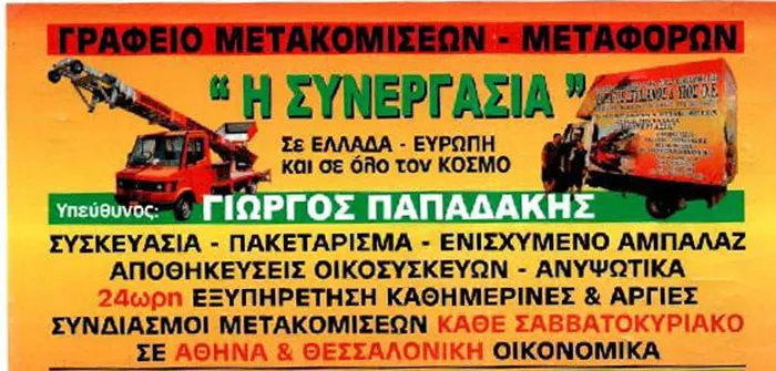Η ΣΥΝΕΡΓΑΣΙΑ – ΠΑΠΑΔΑΚΗΣ ΓΙΩΡΓΟΣ είναι μια οικογενειακή επιχείρηση στον Βόλο. Με πολυετή εμπειρία στο χώρο των Μετακομίσεων – Μεταφορών, διαθέτει εξειδικευμένο και άρτια εκπαιδευμένο προσωπικό στη μεταφορά. Με ιδιόκτητα Φορτηγά και φορτοταξί είμαστε σε θέση να καλύψουμε την οποιαδήποτε ανάγκη σας για Μεταφορά Μετέγκατασταση σε όλη την Ελλάδα. Στην εταιρεία μας η ασφάλεια των οικοσκευών σας και των προϊόντων σας είναι πρωταρχικός μας σκοπός. Καλέστε μας για να επωφεληθείτε τις προνομιακές μας τιμές!