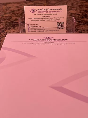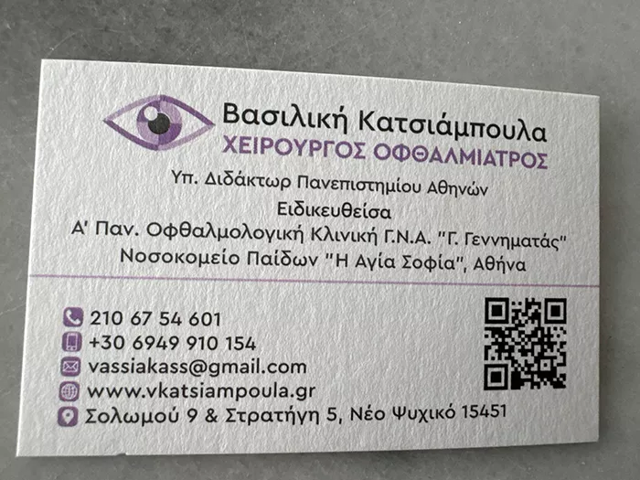 Η Κατσιάμπουλα Βασιλική MD, PhDc είναι Χειρουργός Οφθαλμίατρος και διατηρεί ιδιωτικό ιατρείο στο Νέο Ψυχικό στην Αθήνα. Αποφοίτησε από την Ιατρική Σχολή του Πανεπιστημίου Πατρών και ειδικεύτηκε στην Οφθαλμολογία στο Γενικό Νοσοκομείο Παίδων "Η Αγία Σοφία" και στην Α' Πανεπιστημιακή Οφθαλμολογική Κλινική του Γενικού Νοσοκομείου Αθηνών "Γ. Γεννηματάς", εργαζόμενη δίπλα σε διακεκριμένους καθηγητές Οφθαλμολογίας με κύριο αντικείμενο τις παθήσεις του κερατοειδούς. Ταυτόχρονα, είναι Υποψήφια Διδάκτωρ της Ιατρικής Σχολής του Εθνικού και Καποδιστριακού Πανεπιστημίου Αθηνών. Έχει δημοσιεύσει εργασίες σε διεθνή επιστημονικά περιοδικά και έχει παρουσιάσει σε ελληνικά, ευρωπαϊκά και διεθνή συνέδρια. Είναι μέλος της Ευρωπαϊκής Εταιρείας Καταρράκτη και Διαθλαστικής χειρουργικής και της Ελληνικής Οφθαλμολογικής Εταιρείας, καθώς και της Ελληνικής Εταιρείας Υαλοειδούς- Αμφιβληστροειδούς. Είναι μέλος του Ιατρικού Συλλόγου του Μονάχου, Γερμανίας και της Βέρνης, Ελβετίας. Στο ιατρείο της αναλαμβάνει περιστατικά που καλύπτουν όλο το φάσμα της Οφθαλμολογίας σε ενήλικες και παιδιά καθώς και χειρουργικά περιστατικά.