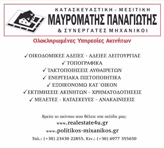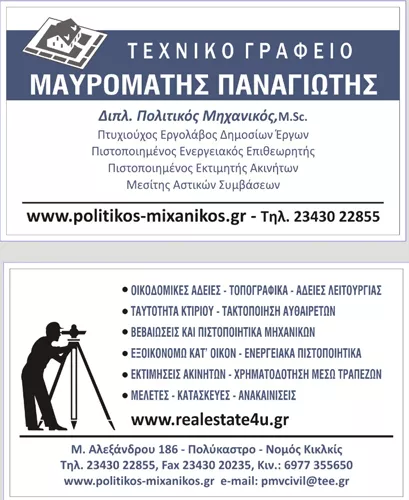 Ο διπλωματούχος πολιτικός μηχανικός Μαυρομάτης Παναγιώτης, με έδρα το Πολύκαστρο στο Κιλκίς, διατηρεί τεχνικό γραφείο προσφέροντας υπηρεσίες υψηλών προδιαγραφών. Ο Παναγιώτης Μαυρομάτης, μετά την ολοκλήρωση των σπουδών του, έκανε μεταπτυχιακό στο Πανεπιστήμιο Portsmouth, U.K., ενώ φροντίζει να ενημερώνεται διαρκώς για τις σύγχρονες απαιτήσεις στο χώρο της κατασκευής. Με άρτια τεχνική κατάρτιση, γνώση και εμπειρία, καλύπτει ένα ευρύ φάσμα υπηρεσιών του κτιριακού τομέα, που ξεκινάει από την εμπεριστατωμένη μελέτη και την έκδοση οικοδομικών αδειών και εκτείνεται έως την αποπεράτωση της κατασκευής. Το τεχνικό γραφείο του εξυπηρετεί το νομό Κιλκίς και όλες τις περιοχές της Μακεδονίας, με γνώμονα την ανάπτυξη σχέσεων εμπιστοσύνης με τους πελάτες και την άριστη εξυπηρέτησή τους, στις πλέον προσιτές τιμές. | Ο Παναγιώτης Μαυρομάτης έχει κατασκευάσει, με επιτυχία, ένα πλήθος ιδιωτικών έργων, ενώ είναι και πτυχιούχος εργολήπτης Δημοσίων Έργων. Εργάζεται, επίσης, ως Ενεργειακός Επιθεωρητής, εκδίδοντας πιστοποιητικά ενεργειακής απόδοσης, ενώ είναι και πιστοποιημένος Εκτιμητής Ακινήτων (Valuer in Real Estate Property).