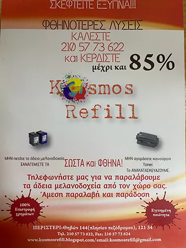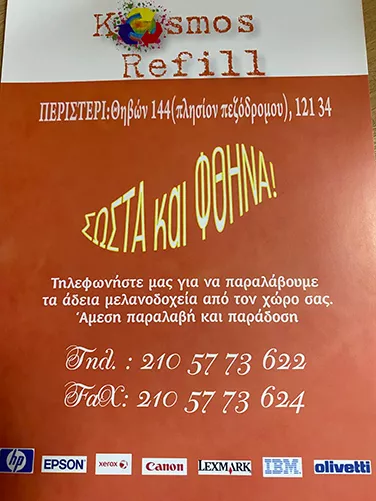 Ειδικευόμαστε στην ανακατασκευή και αναγόμωση των μελανοδοχείων INK-JET και LASER/TONER. Ανακατασκευάζουμε όλες τις μάρκες και όλους τους τύπους των εκτυπωτών σε ποσοστό 95% της αγοράς. Παρέχουμε 100% εγγύηση για όλα μας τα προϊόντα. Διαθέτουμε επίσης όλων των τύπων ORIGINAL προϊόντων. Τα μελάνια και toner που κατασκευάζουμε έχουν αξεπέραστης ποιότητας αδιάβροχο μελάνι DuraFirm Technology με κατοχυρωμένη πατέντα σε παγκόσμιο επίπεδο. Τα σύγχρονα μέσα και μηχανήματα που χρησιμοποιούμε στην ανακατασκευή των μελανιών σε συνδυασμό με τα καλύτερα υλικά και τις χαμηλές τιμές αποτελούν εγγύηση για τα προϊόντα μας.