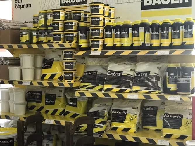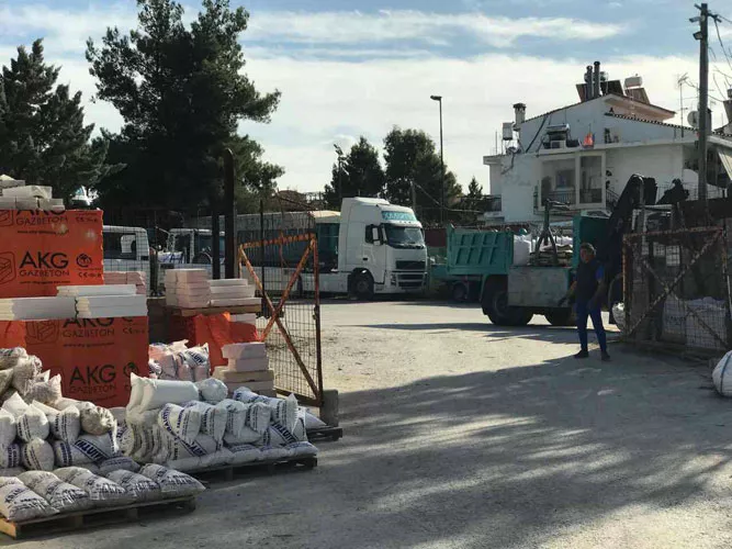 Οικοδομικά υλικά Κεραμίδια σε όλα τα είδη και χρώματα Μονωτικά υλικά Κόλλες - Αρμόστοκοι Τούβλα Αδρανή δομικά υλικά (Άμμος, Χαλίκι, Γαρμπίλι, Ρυζάκι, Μαρμαρόσκονη) Τσιμέντα (Μαύρο, Λευκό) Ασβεστοπολτός - Ασβέστης Άμμος Χρώματα Θερμομονωτικές πλάκες Πέτρες