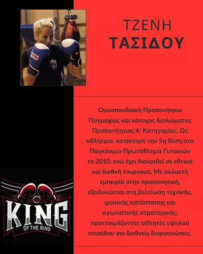 Η σχολή πυγμαχίας - μποξ King of the Ring λειτουργεί στην καρδιά της Αθήνας, προσφέροντας προπονήσεις πυγμαχίας από έμπειρους και καταξιωμένους προπονητές.