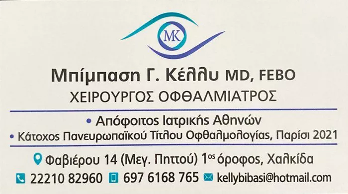 Η Μπίμπαση Κέλλυ (Γλυκερία) είναι Χειρουργός Οφθαλμίατρος και διατηρεί ιδιωτικό ιατρείο στη Χαλκίδα Ευβοίας. Ολοκλήρωσε με Άριστα την προπτυχιακή της εκπαίδευση στη Χαλκίδα και μετά από Πανελλήνιες εξετάσεις εισήχθη στην Ιατρική Σχολή του Εθνικού και Καποδιστριακού Πανεπιστημίου Αθηνών, από όπου αποφοίτησε το 2012 με βαθμό πτυχίου Λίαν Καλώς (8,3). Απέκτησε εμπειρία στην Εξέταση Παιδιών καθώς εκπαιδεύτηκε επί 1,5 χρόνο στην Παιδο-οφθαλμολογική κλινική του Αγλαΐα Κυριακού και στη συνέχεια στην Οφθαλμολογία Ενηλίκων και σε μεγάλο αριθμό Χειρουργείων Καταρράκτη στο ΓΝΠ Τζάνειο. Το 2019 έλαβε τον τίτλο ειδικότητας της Οφθαλμολογίας και παρέμεινε ως ειδική πλέον χειρουργός οφθαλμίατρος στο ΓΝΠ Τζάνειο, όπου απέκτησε ακόμα μεγαλύτερη εμπειρία στη Χειρουργική Καταρράκτη. To 2021 μετά από επιτυχείς πανευρωπαϊκές εξετάσεις που διεξήχθησαν με έδρα το Παρίσι κατέκτησε τον Πανευρωπαϊκό Τίτλο Οφθαλμολογίας (FEBO).