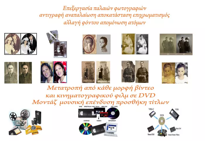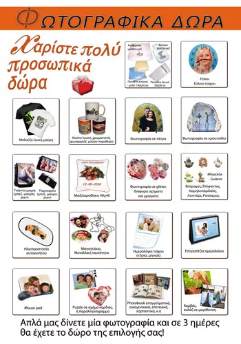 Προσφέρουμε το σύνολο των φωτογραφικών προϊόντων. ΕΓΚΥΡΕΣ φωτογραφίες ταυτότητας, διαβατήριου, δίπλώματος οδήγησης, άδεια χειριστή ταχύπλοου, διαβατήρια, ταυτότητες άλλων χωρών, visa, απολυτήρια , εξετάσεις Λυκείου, πτυχίων και κάθε άλλο έγγραφο. Παράδοση μέσα σε 3 λεπτά μόνο, τέλειες εικόνες επεξεργασμένες με Photoshop και αριστο τελικό αποτέλεσμα. Εκτύπωση σε όλα τα μεγέθη φωτογραφιών και τα υλικά, (καμβά, αλουμίνιο, ξύλο κ.ά.) στις καλυτερες τιμες. Δημιουργούμε ψηφιακά άλμπουμ σε κάθε επιθυμητή διάσταση και φινίρισμα. Μετατροπη από βιντεοκασέτες και κινηματογραφικά φιλμ σε DVD, σκανάρισμα φωτογραφιών, φιλμ, κάθε τύπου και κασετών ήχου. Φωτογράφιση και βιντεοκάλυψη Γάμου και Βάπτισης με τον καλύτερο τρόπο και σύμφωνα με τις επιθυμίες σας χρησιμοποιώντας σύγχρονα μέσα όπως Drone, 4Κ κ.ά. Στο studio μας φωτογραφίζουμε για καταλόγους, για ανάρτηση σε ιστοσελίδες, ηλεκτρονικά καταστήματα, πορτρέτα για εταιρικά προφίλ, βιογραφικά και μέσα κοινωνικής δικτυωσης. Μια πολύ μεγάλη σειρά από φωτογραφικά δωρα πληρη γκάμα από κορνίζες, ξύλινες, silver plate, πολυκορνίζες, θεματικές, μινιατούρες ποκιλία από άλμπουμ φωτογραφιών σε κάθε μέγεθος και αφθονία εξωφύλλων είναι εδώ για εσάς.