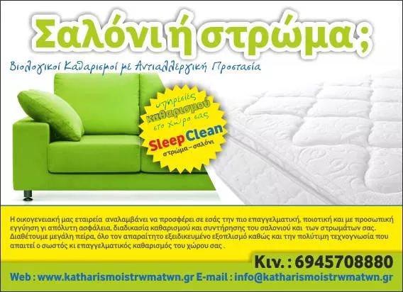 Η εταιρεία μας SLEEP CLEAN αναλαμβάνει υπέυθυνα να διαφυλλάξει τη σωστή υγιεινή και καθαριότητα του ύπνου σας – ενός από τα πολυτιμότερα αγαθά του ανθρώπου. Διασφαλίζουμε για εσάς ένα στρώμα πραγματικά καθαρό, απαλλαγμένο από βλαβερούς για την υγεία μας μικροοργανισμούς, βακτήρια, ακάρεα και τα περιττώματά τους και οτιδήποτε βρίσκει την ευκαιρία να βρει καταφύγιο μέσα στο στρώμα μας. Με αυτόν τον τρόπο ελαχιστοποιούμε την πιθανότητα εμφάνισης συμπτωμάτων κακής υγείας – όπως άσθμα, έκζεμα, αλλεργίες, πυρετός κι άλλα πολλά – και βέβαια αναβαθμίζουμε αυτόματα την ποιότητα του ύπνου σας τόσο για σας όσο και για τα παιδιά σας.
