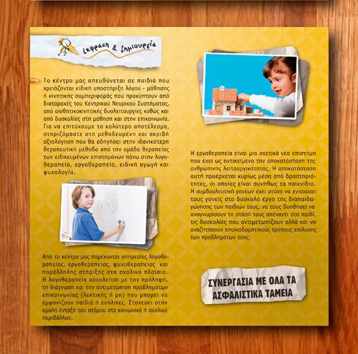 Παρέχονται υπηρεσίες εργοθεραπείας και λογοθεραπείας, με στόχο την υποστήριξη παιδιών με δυσκολίες λόγου, επικοινωνίας, μάθησης και ανάπτυξης, καθώς και την ενίσχυση της αυτονομίας και της σχολικής τους προσαρμογής.