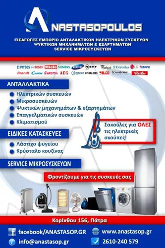 Σακουλες Ηλεκτρικης Σκουπας, Χυτρες, Ατμοσιδερα Service, Επισκευη Σομπας, Επισκευη Κλιματιστικου, Service Πλυντηριου, Επισκευη Ψυγειου, Κανατες Για Καφετιερες, Λαστιχα Ψυγειου, Αντιστασεις Κουζινας