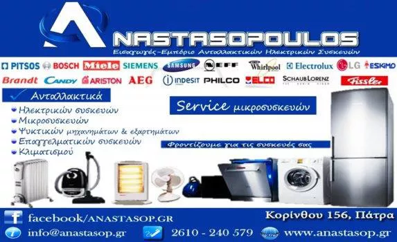 Το κατάστημα ΑΝΑΣΤΑΣΟΠΟΥΛΟΣ ELEKTRIK PARTS ιδρύθηκε στην Πάτρα, κατόπιν αναγκών της εποχής μας στον τομέα υποστήριξης των τεχνικών για τις επισκευές των ηλεκτρικών συσκευών, οικιακών & επαγγελματικών. Με τις συνεχείς εισαγωγές και συνεργασίες μας με τις εταιρείες του είδους και την υψηλή παροχή υπηρεσιών και ποιότητας υλικών, προσδοκούμε να παίξουμε ηγετικό ρόλο στον τομέα μας.