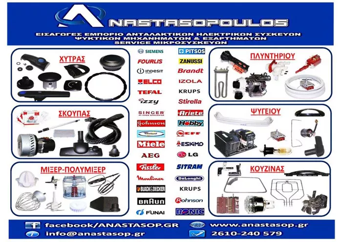 Σε μας θα βρείτε ανταλλακτικά για πλυντήρια, ψυγεία, κουζίνες, κλιματιστικά, σκούπες, χύτρες, μίξερ, μπλέντερ, ατμοσίδερα, καφετιέρες, σόμπες, τοστιέρες, σακούλες για ηλεκτρικές σκούπες, κανάτες για όλες τις καφετιέρες, καθαριστικά και αξεσουάρ και γενικά, όλες τις συσκευές όλων των εταιρειών. Γνήσια ανταλλακτικά: Bosch, Neff, Siemens, Pitsos, Philips, Stirella, Miele, Kenwood, Izzy, Moulinex, Fisler, Tefal, Seb, Krups, Sitram, Delonghi, LG, Samsung, Singer, Juropro, Aeg, Hoover, Candy, Brandt, Electrolux, Whirlpool, Karcher, Black & Decker, Ariston, Arcelik, Beko, Vestel κ.λπ.