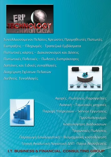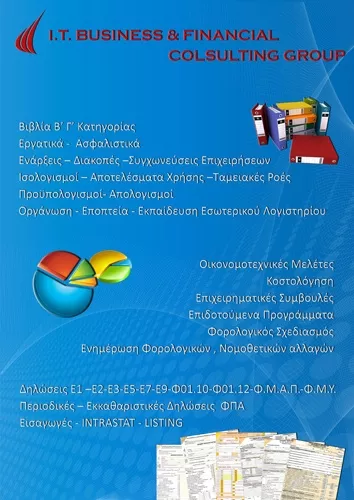 Λογιστικές και Φορολογικές υπηρεσίες: Λογιστική υποστήριξη όλων των εταιρικών μορφών και ατομικών επιχειρήσεων. Τήρηση βιβλίων Β΄& Γ΄ κατηγορίας. Σύνταξη Φορολογικών δηλώσεων, λογιστική κόστους, εργασιακές σχέσεις, μισθοδοσία, οργάνωση εσωτερικών τμημάτων και διενέργεια προληπτικών ελέγχων. Μηχανογραφικές Υπηρεσίες: Mantis Lvision III. Η συγκεκριμένη εφαρμογή οργανώνει όλες τις εργασίες που εκτελούνται στις αποθήκες με τη χρήση ασύρματων τερματικών και συστημάτων Barcode, Voice Picking, Pick to Light και άλλα εξειδικευμένα συστήματα. Εφαρμογή Forecasting Αποθεμάτων, προβλέψεις αγορών, πωλήσεων και διαχείριση υπολοίπου αποθεμάτων ασφαλείας. ERP εφαρμογές, ανάλυση αναγκών της επιχείρησης, πρόταση για την επιλογή της καλύτερης λύσης. Εγκατάσταση, παραμετροποίηση και συντήρηση εφαρμογών ERP. Υπηρεσίες Οργάνωσης: Οργάνωση Κέντρων Διανομής και Αποθήκευσης. Αναλαμβάνουμε τον σχεδιασμό, την υλοποίηση και τη λειτουργία αποθηκευτικών κέντρων και εφαρμογή ειδικών συστημάτων Logistics.