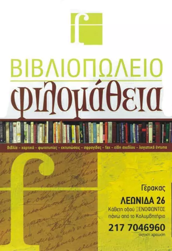 Στο βιβλιοπωλείο ΦΙΛΟΜΑΘΕΙΑ στον Γέρακα, θα βρείτε μεγάλη ποικιλία από: Βιβλία λογοτεχνίας ελληνικά και ξενόγλωσσα Παιδική - εφηβική λογοτεχνία Ξενόγλωσσο εκπαιδευτικό βιβλίο Βιβλία σχολικά Γραφική Ύλη Σχολικές Τσάντες Χαρτικά - Βιβλιοδεσίες - Πλαστικοποιήσεις Ντύσιμο βιβλίων (Colibri System) Σεμινάρια - Χειροτεχνίες - Είδη Ζωγραφικής Είδη σχεδίου Είδη Πάρτι - Παιχνίδια Είδη Δώρων Φωτοτυπίες - Φαξ – Mail – Scan Εκτυπώσεις από USB- STICK Σφραγίδες – επιγραφές Λογιστικά Έντυπα Άλμπουμ φωτογραφιών Είδη συσκευασίας