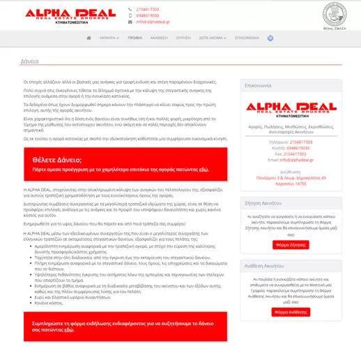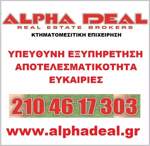 ALPHA DEAL το όνομα που χρόνο με τον χρόνο χτίζει μια ξεχωριστή έννοια στην αγοραπωλησία ακινήτων. Μέλος του Συλλόγου Μεσιτών Αστικών Συμβάσεων Αθηνών-Αττικής ιδρύθηκε το 2007 με στόχο να προσφέρει υψηλού επιπέδου παροχή υπηρεσιών στη διαμεσολάβηση για τη σύναψη αστικών συμβάσεων πώλησης, μίσθωσης ακινήτων, ακινήτων προς οικοδόμηση με αντιπαροχή, εκτιμήσεις ακινήτων παρέχοντας παράλληλα στους πελάτες της ενημέρωση, και καθοδήγηση σε ζητήματα που αφορούν τη διαδικασία της αγοράς, πώλησης και μίσθωσης ακινήτων. Η ομάδα μας αποτελείται μόνο από έμπειρους επαγγελματίες Μεσίτες Αστικών Συμβάσεων με πολυετή εμπειρία, και συνεχή εκπαίδευση κι εξειδίκευση στο αντικείμενο τους, ώστε να καλύπτουν την κάθε στεγαστική σας ανάγκη με απόλυτη εμπιστευτικότητα, ακεραιότητα και επαγγελματισμό. Επίσης εξειδικευμένο και αποτελεσματικό διοικητικό, γραμματειακό και άλλο προσωπικό καθώς και συνεργάτες Μηχανικοί, Δικηγόροι και Συμβολαιογράφοι ενημερώνουν, υποστηρίζουν και καθοδηγούν για την σωστή και αποτελεσματική ολοκλήρωση κάθε διαδικασίας. Σκοπός μας, η πλήρης ικανοποίηση του πελάτη.