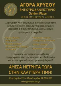 Στην GOLDEN PLACE αγοράζουμε παλιά κοσμήματα, χρυσό, ασήμι, χρυσές λίρες, ασημένια κοσμήματα & σκεύη, πολύτιμους λίθους, ρολόγια, γρήγορα και εχέμυθα! Η πολυετής μας πείρα στον κλάδο της αργυροχρυσοχοΐας, μας επιτρέπει μα αξιολογούμε και να σας προσφέρουμε την πιο υψηλή τιμή! Αγοράζουμε επίσης αντικείμενα υπογεγραμμένα παλιά, από γυαλί, πορσελάνη, μέταλλα, συλλογές από νομίσματα, στρατιωτικά παράσημα, παλιά παιδικά παιχνίδια, επιτραπέζια καθώς και κούκλες πλαστικές επώνυμων βιοτεχνών. ΑΜΕΣΑ ΜΕΤΡΗΤΑ ΤΩΡΑ ΣΤΗΝ ΚΑΛΥΤΕΡΗ ΤΙΜΗ! ΓΡΗΓΟΡΑ ΚΑΙ ΕΧΕΜΥΘΑ! Για τα κοσμήματά σας επισκεφθείτε και το κοσμηματοπωλείο μας στο Ν.Ψυχικό, Λάμπρου Πορφύρα 42, τηλ. 210-6233555.