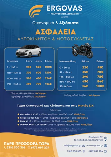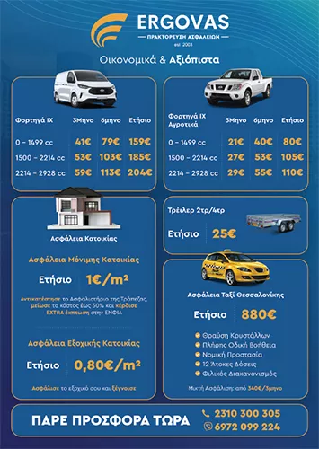 Το 2003, ιδρύθηκε από έμπειρα στελέχη της ασφαλιστικής αγοράς η εταιρεία ΕΡΓΟΒΑΣ Α.Ε – ΠΡΑΚΤΟΡΕΥΣΗ ΑΣΦΑΛΕΙΩΝ στην περιοχή της Θεσσαλονίκης, με διακριτικό τίτλο ERGOVAS A.E. Σκοπός της ERGOVAS A.E από την πρώτη κιόλας ημέρα λειτουργίας της, ήταν η συνεχής διερεύνηση της ασφαλιστικής αγοράς ώστε μέσα από νέα ευέλικτα και ανταγωνιστικά προϊόντα να παρέχει όσο το δυνατόν πληρέστερες και συμφέρουσες λύσεις τόσο σε επαγγελματίες όσο και σε ιδιώτες. Σε αυτή τη μακρόχρονη πορεία μας στον απαιτητικό χώρο των ασφαλειών, έχουμε καταφέρει να καθιερωθούμε στη συνείδηση των καταναλωτών και των συνεργατών ασφαλιστών, ως ένα γραφείο ασφαλειών που παρέχει ένα σταθερό επαγγελματικό περιβάλλον, που καλύπτει τις ασφαλιστικές τους ανάγκες. Δέσμευσή μας είναι ο σεβασμός στον πελάτη, στο συνεργάτη ασφαλιστή, αλλά και τον εργαζόμενο παρέχοντας συνεχή υποστήριξη καθ΄όλη τη διάρκεια του συμβολαίου μας. Οι αξίες βάσει των οποίων πορευόμαστε είναι ο επαγγελματισμός, η συνέπεια, η καινοτομία και η υπευθυνότητα. Εμπιστευθείτε κι εσείς τις ασφαλιστικές υπηρεσίες που σας προσφέρει η εταιρεία ERGOVAS A.E. και απολαύστε πλήρη κάλυψη κάθε ασφαλιστικής σας ανάγκης.