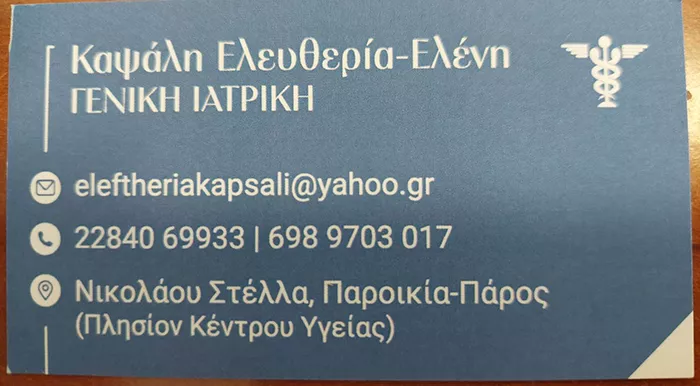 Η Γενική Ιατρός κα. Ελευθερία Καψάλη είναι Πτυχιούχος Ιατρικής σχολής της L'Aquila της Ιταλίας. Ειδικευόμενη στην Γενική/Οικογενειακή Ιατρική. Υπηρεσίες κατόπιν ραντεβού. Για επείγοντα περιστατικά και κατ' οίκον επίσκεψη, όλο το 24ωρο, κατόπιν τηλεφωνικής επικοινωνίας στο τηλ.: 6989703017