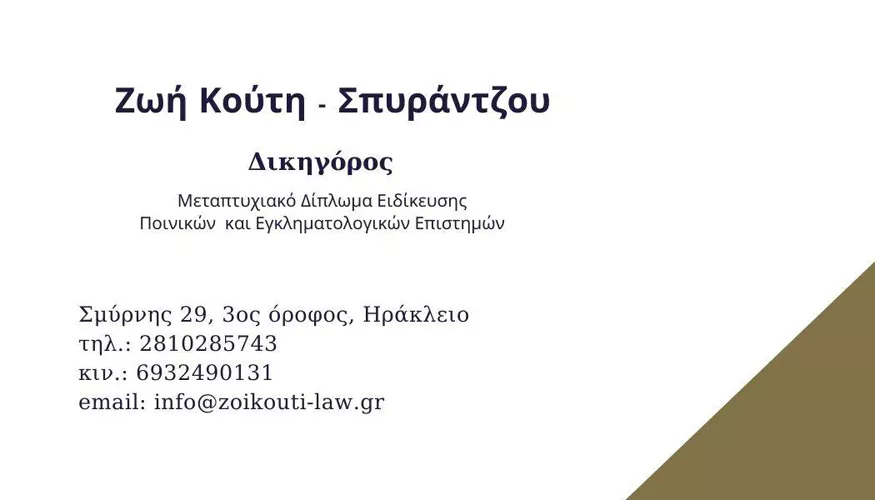 Η δικηγόρος Ζωή Κούτη – Σπυράντζου είναι μία άρτια καταρτισμένη νομικός, απόφοιτος της Νομικής Σχολής του Αριστοτελείου Παν. Θεσ/νίκης κάτοχος Μεταπτυχιακού Διπλώματος Ειδίκευσης στο Ποινικό Δίκαιο και τις Εγκληματολογικές Επιστήμες. Διατηρεί δικηγορικό γραφείο στο κέντρο του Ηρακλείου Κρήτης στο οποίο παρέχονται υψηλού επιπέδου νομικές υπηρεσίες (παροχή νομικών συμβουλών καθώς και εκπροσώπηση ενώπιον οποιασδήποτε αρχής και Δικαστηρίου) καλύπτοντας ευρύ φάσμα υποθέσεων τόσο στους κλασικούς όσο και στους πλέον σύγχρονους τομείς του Αστικού, Εμπορικού, Ποινικού και Διοικητικού Δικαίου. Αρχή μας είναι η προάσπιση του συμφέροντος του πελάτη με υπευθυνότητα, αμεσότητα, αποτελεσματικότητα, τεκμηριωμένη θεμελίωση και έμφαση στη λεπτομέρεια, διά της συνεχούς και αδιάλειπτης επιστημονικής ενημέρωσης και παρακολούθησης των νομοθετικών και νομολογιακών εξελίξεων. Στα πλαίσια μίας ολοκληρωμένης παροχής νομικών υπηρεσιών το γραφείο μας διατηρεί συνεργασίες με αξιόλογα δικηγορικά γραφεία σε ολόκληρη την Κρήτη και την Ελλάδα, καθώς και με έγκριτους επιστήμονες διαφόρων ειδικοτήτων (συμβολαιογράφους, λογιστές, μηχανικούς κ.α.). Η δικηγόρος γνωρίζει άριστα την Αγγλική και Γερμανική γλώσσα και πολύ καλά τη Γαλλική γλώσσα. Είναι εγγεγραμμένη από το έτος 2013 στο Δικηγορικό Σύλλογο Ηρακλείου.