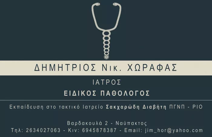 Ο ιατρός Χωραφάς Δημήτριος είναι απόφοιτος του Πανεπιστημίου Πατρών με πτυχίο του Τμήματος Φαρμακευτικής και Ιατρικής σχολής, με βαθμό Λίαν Καλώς. Έλαβε την ειδικότητα της Παθολογίας στο Πανεπιστημιακό Γενικό Νοσοκομείο Πατρών “Παναγιά η Βοήθεια”, όπου και εκπαιδεύτηκε ιδιαιτέρως σε θέματα Σακχαρώδους Διαβήτη Ι & ΙΙ. Με συνεχή ενημέρωση και παρακολούθηση Συνεδρίων ασκεί τα ιατρικά του καθήκοντα στο ιδιωτικό Ιατρείο του, πάντα με γνώμονα τον ασθενή ως ”άνθρωπο”, δίνοντας λύσεις σε παθολογικά θέματα υγείας.