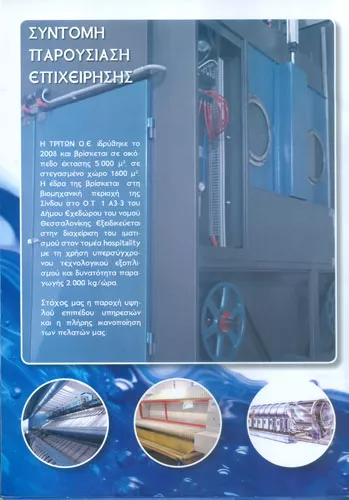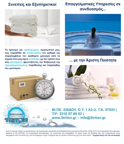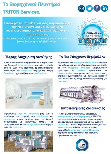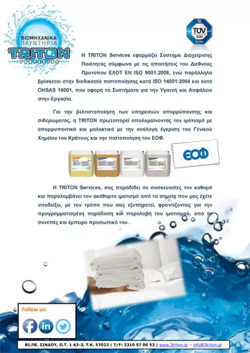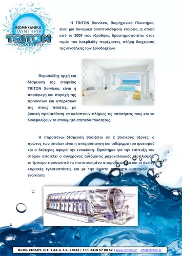 H Triton services είναι μια δυναμικά αναπτυσσόμενη εταιρεία η οποία δραστηριοποιείται στον τομέα του hospitality παρέχοντας πλήρη διαχείριση της λινοθήκης των ξενοδοχείων. Θεμελιώδης αρχή και δέσμευση της εταιρείας ΤΡΙΤΟΝ είναι η παραγωγή και παροχή στους πελάτες της προϊόντων και υπηρεσιών, τα οποία να καλύπτουν πλήρως τις απαιτήσεις τους και να διασφαλίζουν τα επιθυμητά επίπεδα ποιότητας.