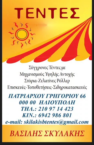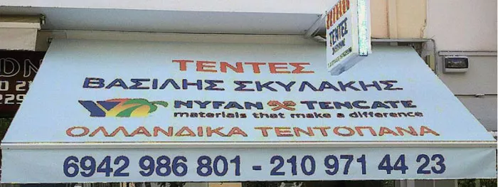 Τώρα, η άριστή μας εργασία με την εγγύηση στην ποιότητα (αφού προσφέρουμε τις πλέον σύγχρονες τέντες με μηχανισμούς υψηλής αντοχής σε συνδυασμό με τα καλύτερα τεντόπανα της αγοράς) προσφέρεται και στις πλέον ανταγωνιστικές τιμές. ΕΓΓΥΗΣΗ ΣΤΗΝ ΠΟΙΟΤΗΤΑ ΚΑΙ ΤΗΝ ΤΙΜΗ Επί 10 συναπτά έτη, εργάστηκα στην εταιρεία A. και Π. Λούη - Β. Σκυλάκης ΟΕ. Κατόπιν για 2 έτη εργάστηκα στο GRANT RESORT LAGONISI. Επειδή για όσους με ξέρουν δε μου αρέσουν τα μεγάλα λόγια αλλά οι πράξεις κάτωθι παρουσιάζω δείγματα από τη δουλειά μου στο Λαγονήσι με ένα βίντεο που έχει φτιαχτεί για GRANT RESORT LAGONISI. Έκθεση: Χρυσοθέμιδος 35 & Δικαιάρχου.
