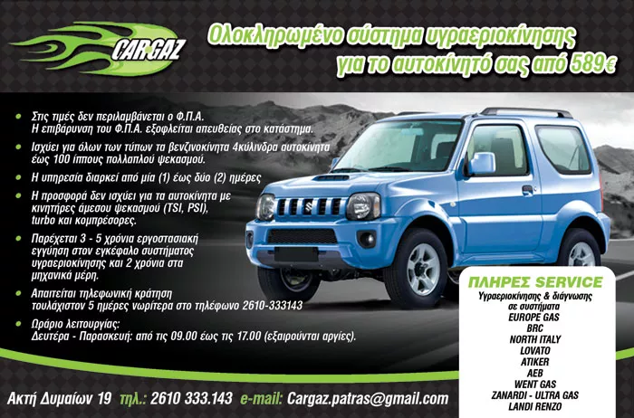 Η εταιρεία Μινέλης Κ. Αντώνιος - Car Gaz δραστηριοποιείται στο χώρο της Υγραεριοκίνησης από το 2010 έως και σήμερα και εδρεύει στη Πάτρα επί της οδού Ακτή Δυμαίων 39. Η εγκατάσταση, η ρύθμιση και η μετ’ έπειτα τεχνική υποστήριξη Συστημάτων Υγραεριοκίνησης, πραγματοποιούνται από τον άρτια εκπαιδευμένο ιδιοκτήτη της εταιρείας που ως εκ τούτου διαθέτει την απαιτούμενη εμπειρία, εξειδίκευση και υπευθυνότητα. Η εγκατάσταση γίνεται με τον πλέον τεχνολογικά αξιόπιστο, ασφαλή και επαγγελματικό τρόπο εντός του συμφωνηθέντος χρόνου. Από την εταιρεία παρέχεται γραπτή εγγύηση καλής λειτουργίας του συστήματος και των εξαρτημάτων από 2-4 χρόνια ανάλογα με το Σύστημα Αεριοκίνησης. Ολοκληρωμένο Σύστημα Υγραεριοκίνησης για το Αυτοκίνητό σας από 650€ + ΦΠΑ 156€.