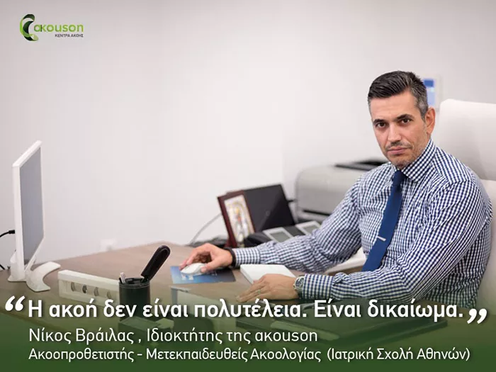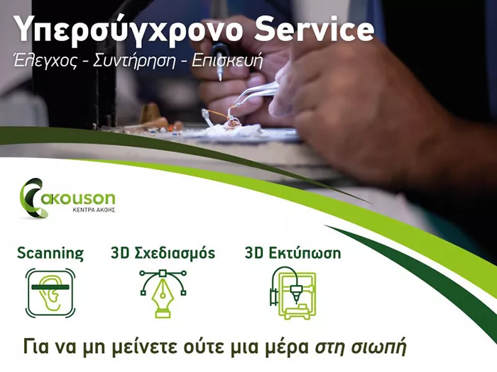 Akouson, founded in 2009 with a customer-centric approach, offers high-quality products and services. Its purpose is to upgrade the life quality of those with hearing loss and educate those who need to protect their hearing in order to maintain it. Akouson has a complete product catalog for hearing and ear hygiene, composed by world acclaimed brands. The company's highly trained and experienced hearing aid dispensers, having a thorough knowledge of audiology, offer consultation to patients daily. Finally, an all-important factor of akouson's premium services is its technologically advanced laboratory. The company's technicians use the most advanced equipment and laser technology in order to produce and repair personalized products.