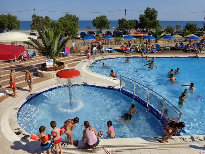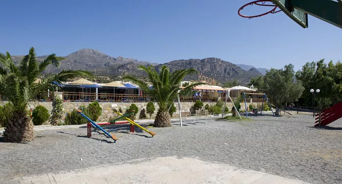 Guests enjoy a wide range of amenities including a swimming pool, restaurant with Cretan cuisine, mini market, playgrounds, BBQ, WiFi, and much more.