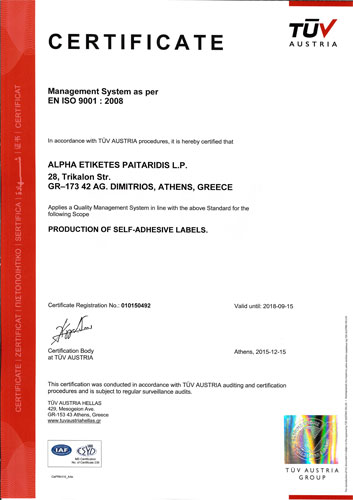 At Alpha Labels we create and produce unique, high quality labels to stand out, to give the comparative advantage of the “first glance” and contribute effectively to the consumer’s final choice. Our company offers creative solutions to customer needs and provides complete services from design to printing and production of the finished product. We offer creative solutions for the needs of your products and we provide complete services, from research and design, to printing and production of the fin product. The application of a variety of printing methods, such as cylindrical printing, silk-screen printing and hot printing, combined with modern technological equipment, specialized know-how and the experience of the human resources of our production unit, guarantee excellence in terms of the end result, specifications and requirements. Our quality policy has been developed and implemented to provide high quality services and optimal satisfaction of our customers needs and requirements for their products. The Quality Management System developed and implemented by Alpha Labels has been certified in accordance with the requirements of the new international standard EN ISO 9001:2015.