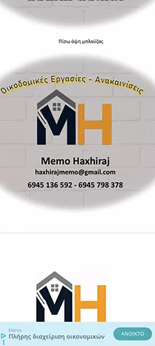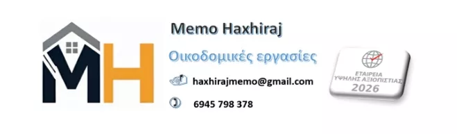 Ο HAXHIRAJ MEMO δραστηριοποιείται στον χώρο των οικοδομικών εργασιών, προσφέροντας αξιόπιστες λύσεις, ελαιοχρωματισμούς, ανακαινίσεις, τοποθέτηση πλακιδίων και ό,τι άλλο χρειαστεί στον τομέα της κατασκευής και της ανακαίνισης. Με προσοχή στη λεπτομέρεια και επαγγελματισμό αναλαμβάνουμε τόσο μικρές επισκευές όσο και μεγαλύτερα έργα, εξασφαλίζοντας ποιοτικό αποτέλεσμα που αντέχει στον χρόνο.