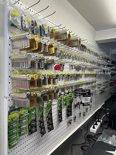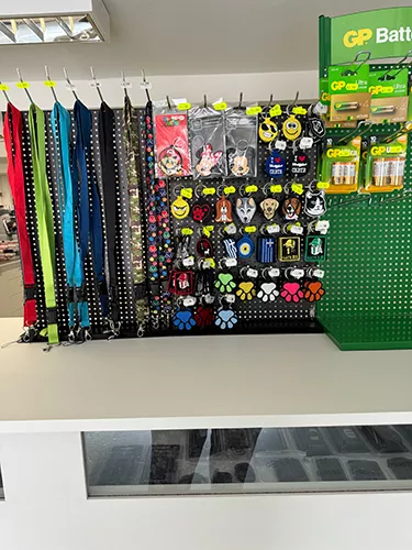 Διαθέτουμε μεγάλη ποικιλία κλειδιών, λουκέτων, μπρελόκ, κλειδαριές, μπαταρίες συσκευών, ηλεκτρονικά κλειδιά, τσιπάκια αυτοκινήτου, τηλεκοντρόλ για γκαραζόπορτες. Αυτό που μας κάνει να ξεχωρίζουμε στο χώρο των κλειδιών είναι η 16χρονη τεχνογνωσία μας και τα μηχανήματα τελευταίας γενιάς που δίνουν άριστη απόδοση των κλειδιών.