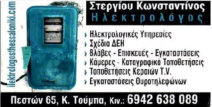 Ηλεκτρολογικές υπηρεσίες (εγκατάστασης, βλάβες 24 ώρες, πιστοποιητικά ΔΕΗ, θεμελιακή γείωση) Αυτοματισμοί Ηλεκτρονικά (έξυπνο σπίτι, επισκευές, εφαρμογές) Θυροτηλέφωνα (εγκατάσταση, επισκευές, βλάβες) Οικιακές συσκευές (επισκευές) Κάμερες, καταγραφικά, συναγερμοί (εγκατάσταση, βλάβες) Τηλεπικοινωνίες Δομημένη καλωδίωση (εγκατάσταση, βλάβες) Δίκτυα, Network (εγκατάσταση, βλάβες)